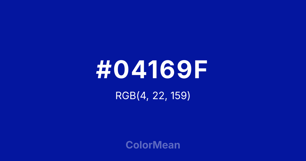 #04169F RGB value is (4, 22, 159). The hex color red value is 4, green is 22, and blue is 159. Its HSL format shows a hue of 233°, saturation of 95 percent, and lightness of 32 percent. The CMYK process values are 97 percent, 86 percent, 0 percent, 38 percent.