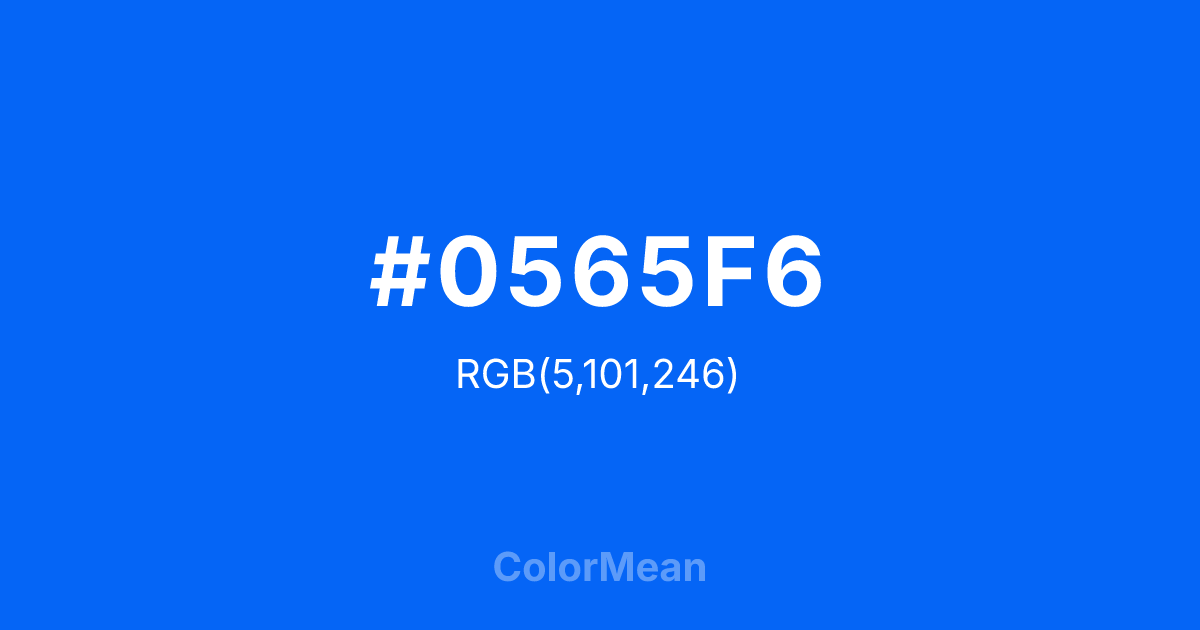 #0565F6 RGB value is (5, 101, 246). The hex color red value is 5, green is 101, and blue is 246. Its HSL format shows a hue of 216°, saturation of 96 percent, and lightness of 49 percent. The CMYK process values are 98 percent, 59 percent, 0 percent, 4 percent.