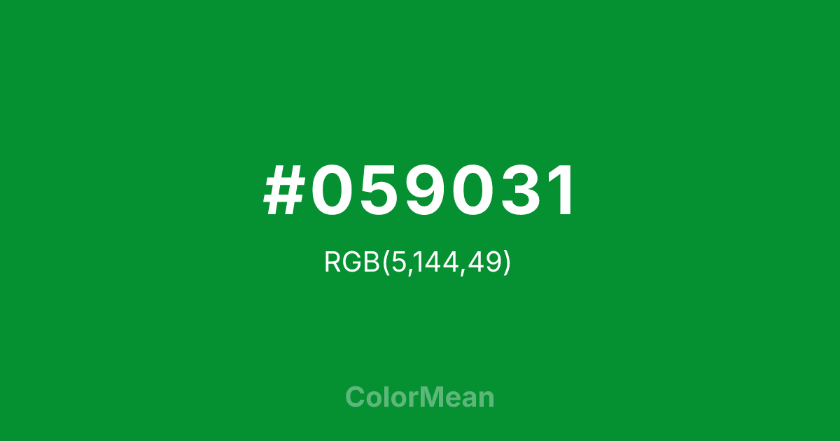 #059031 RGB value is (5, 144, 49). The hex color red value is 5, green is 144, and blue is 49. Its HSL format shows a hue of 139°, saturation of 93 percent, and lightness of 29 percent. The CMYK process values are 97 percent, 0 percent, 66 percent, 44 percent.