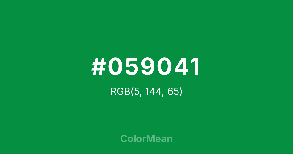 #059041 RGB value is (5, 144, 65). The hex color red value is 5, green is 144, and blue is 65. Its HSL format shows a hue of 146°, saturation of 93 percent, and lightness of 29 percent. The CMYK process values are 97 percent, 0 percent, 55 percent, 44 percent.