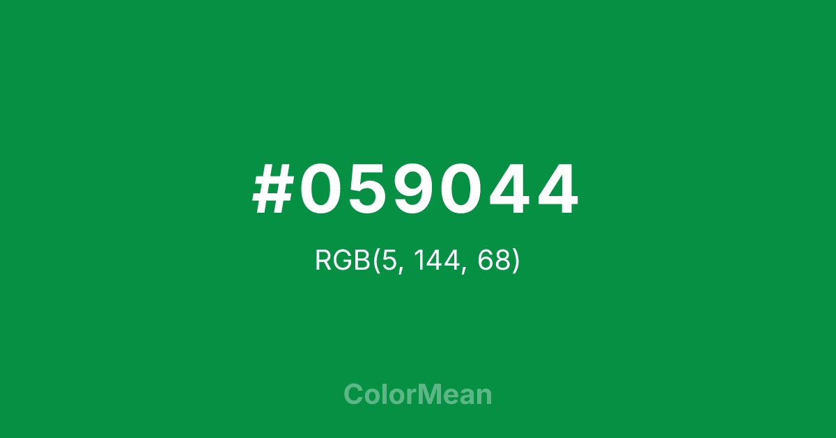 #059044 RGB value is (5, 144, 68). The hex color red value is 5, green is 144, and blue is 68. Its HSL format shows a hue of 147°, saturation of 93 percent, and lightness of 29 percent. The CMYK process values are 97 percent, 0 percent, 53 percent, 44 percent.