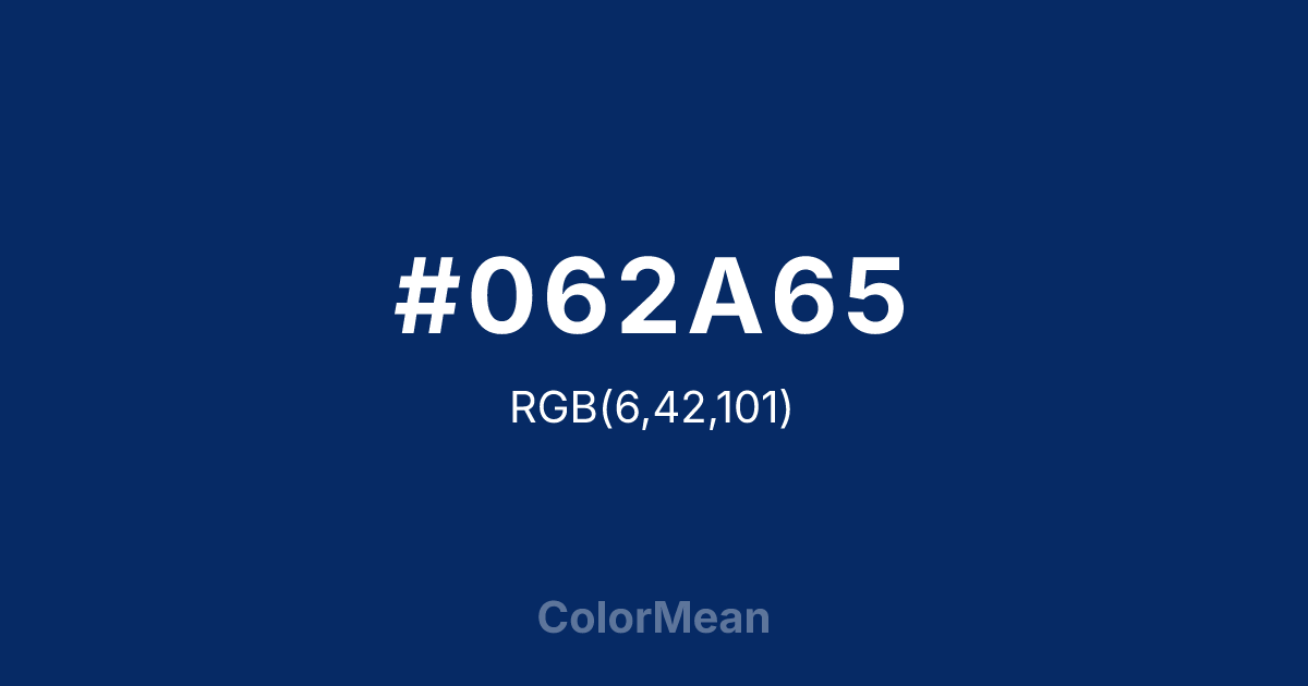 #062A65 RGB value is (6, 42, 101). The hex color red value is 6, green is 42, and blue is 101. Its HSL format shows a hue of 217°, saturation of 89 percent, and lightness of 21 percent. The CMYK process values are 94 percent, 58 percent, 0 percent, 60 percent.
