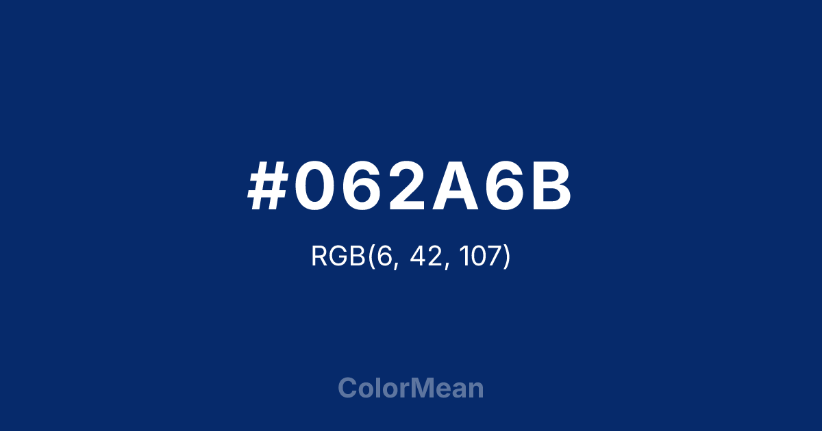 #062A6B RGB value is (6, 42, 107). The hex color red value is 6, green is 42, and blue is 107. Its HSL format shows a hue of 219°, saturation of 89 percent, and lightness of 22 percent. The CMYK process values are 94 percent, 61 percent, 0 percent, 58 percent.