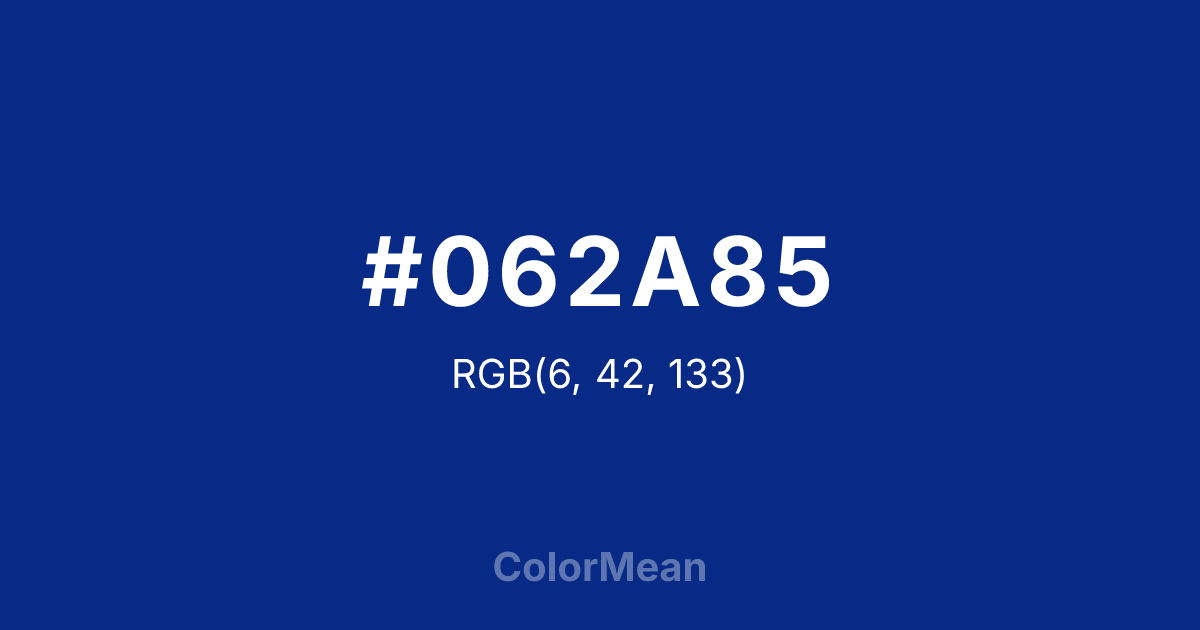 #062A85 RGB value is (6, 42, 133). The hex color red value is 6, green is 42, and blue is 133. Its HSL format shows a hue of 223°, saturation of 91 percent, and lightness of 27 percent. The CMYK process values are 95 percent, 68 percent, 0 percent, 48 percent.