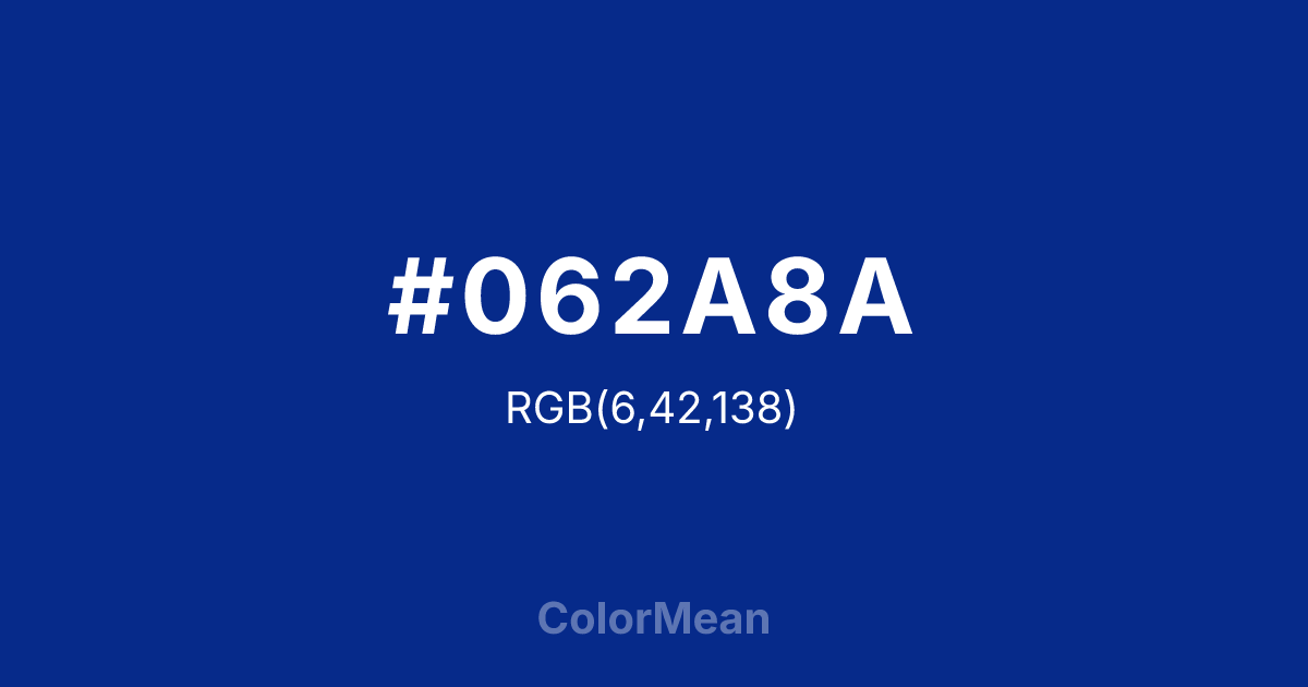 #062A8A RGB value is (6, 42, 138). The hex color red value is 6, green is 42, and blue is 138. Its HSL format shows a hue of 224°, saturation of 92 percent, and lightness of 28 percent. The CMYK process values are 96 percent, 70 percent, 0 percent, 46 percent.