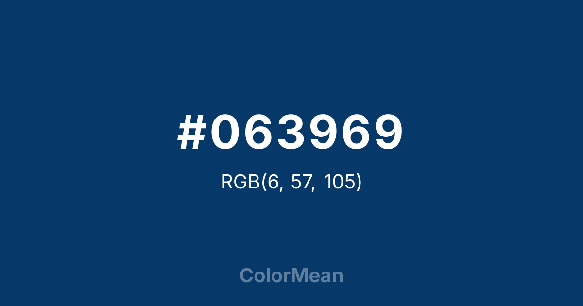 #063969 RGB value is (6, 57, 105). The hex color red value is 6, green is 57, and blue is 105. Its HSL format shows a hue of 209°, saturation of 89 percent, and lightness of 22 percent. The CMYK process values are 94 percent, 46 percent, 0 percent, 59 percent.
