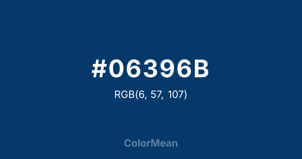 #06396B RGB value is (6, 57, 107). The hex color red value is 6, green is 57, and blue is 107. Its HSL format shows a hue of 210°, saturation of 89 percent, and lightness of 22 percent. The CMYK process values are 94 percent, 47 percent, 0 percent, 58 percent.