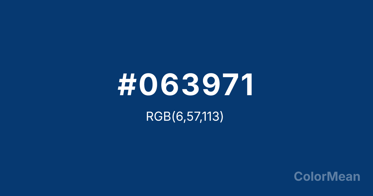 Traffic Blue (#063971) RGB value is (6, 57, 113). The hex color red value is 6, green is 57, and blue is 113. Its HSL format shows a hue of 211°, saturation of 90 percent, and lightness of 23 percent. The CMYK process values are 95 percent, 50 percent, 0 percent, 56 percent.