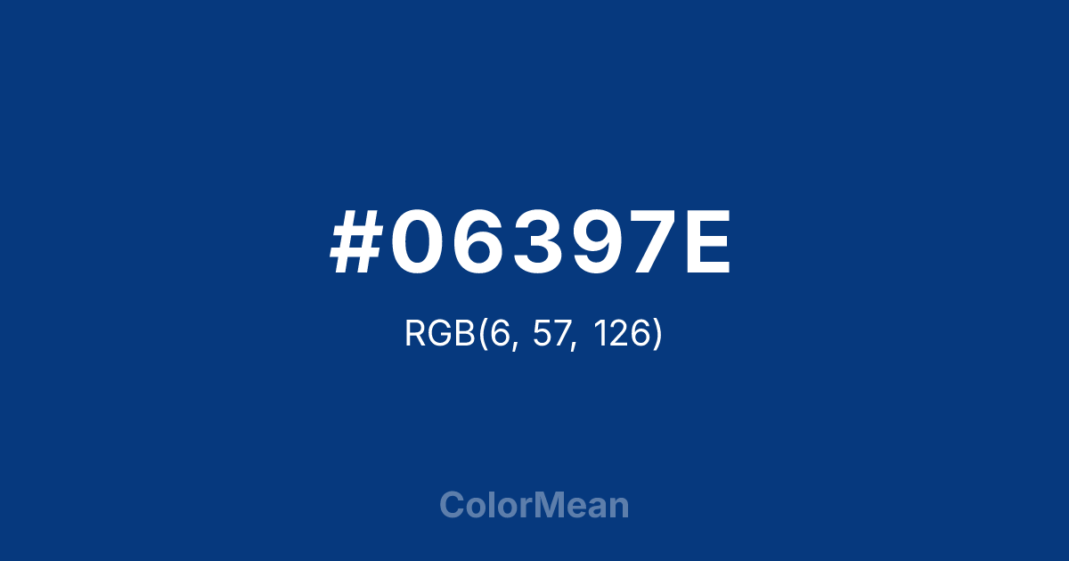 #06397E RGB value is (6, 57, 126). The hex color red value is 6, green is 57, and blue is 126. Its HSL format shows a hue of 215°, saturation of 91 percent, and lightness of 26 percent. The CMYK process values are 95 percent, 55 percent, 0 percent, 51 percent.