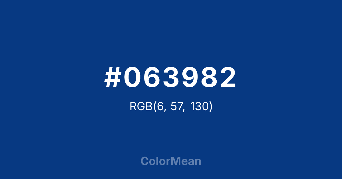 #063982 RGB value is (6, 57, 130). The hex color red value is 6, green is 57, and blue is 130. Its HSL format shows a hue of 215°, saturation of 91 percent, and lightness of 27 percent. The CMYK process values are 95 percent, 56 percent, 0 percent, 49 percent.