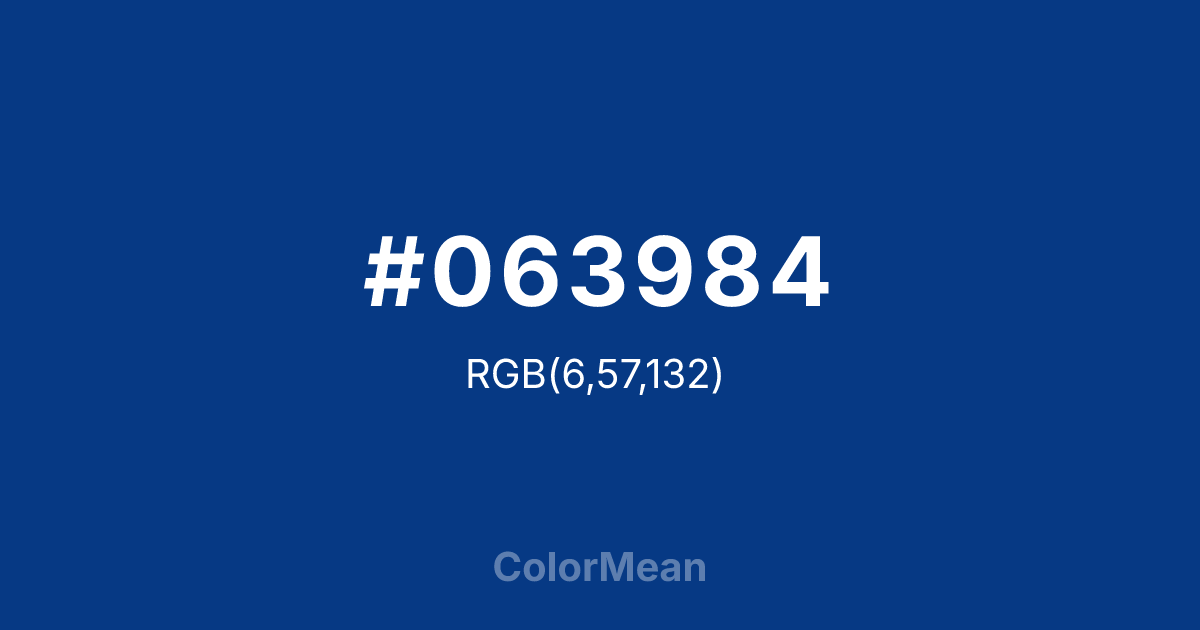 #063984 RGB value is (6, 57, 132). The hex color red value is 6, green is 57, and blue is 132. Its HSL format shows a hue of 216°, saturation of 91 percent, and lightness of 27 percent. The CMYK process values are 95 percent, 57 percent, 0 percent, 48 percent.