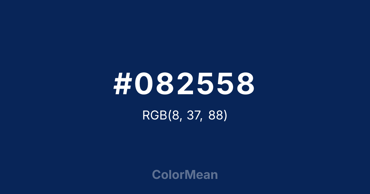 #082558 RGB value is (8, 37, 88). The hex color red value is 8, green is 37, and blue is 88. Its HSL format shows a hue of 218°, saturation of 83 percent, and lightness of 19 percent. The CMYK process values are 91 percent, 58 percent, 0 percent, 65 percent.