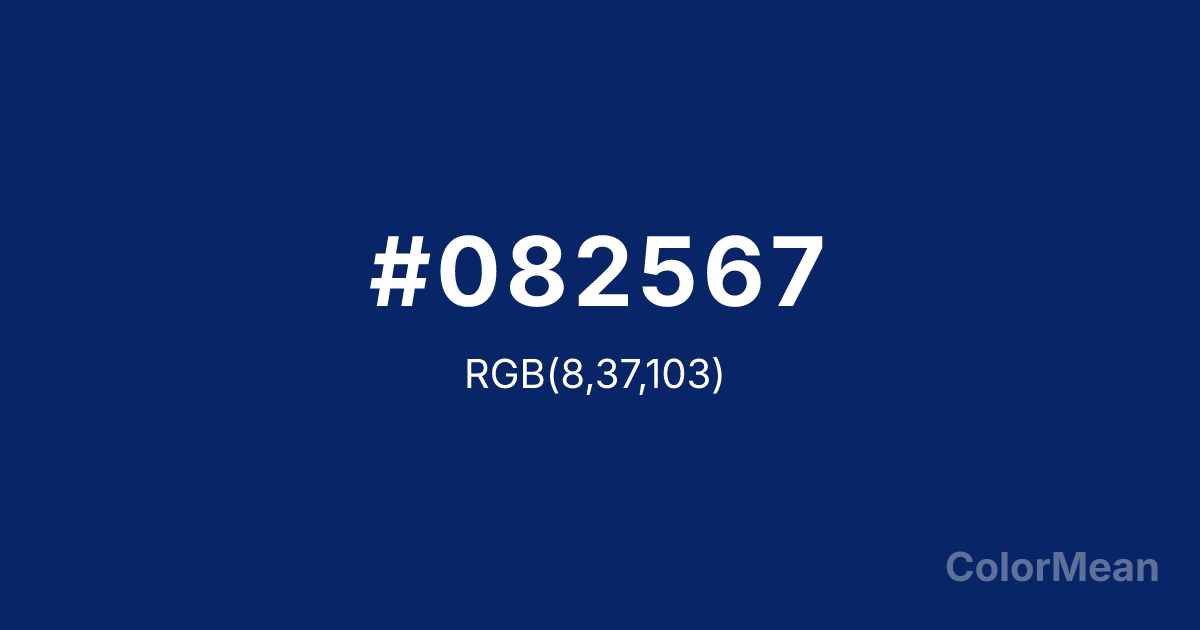 Sapphire (#082567) RGB value is (8, 37, 103). The hex color red value is 8, green is 37, and blue is 103. Its HSL format shows a hue of 222°, saturation of 86 percent, and lightness of 22 percent. The CMYK process values are 92 percent, 64 percent, 0 percent, 60 percent.
