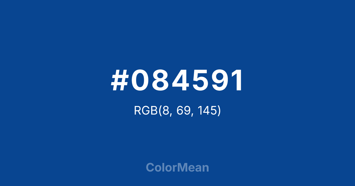 #084591 RGB value is (8, 69, 145). The hex color red value is 8, green is 69, and blue is 145. Its HSL format shows a hue of 213°, saturation of 90 percent, and lightness of 30 percent. The CMYK process values are 94 percent, 52 percent, 0 percent, 43 percent.