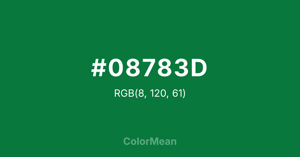 #08783D RGB value is (8, 120, 61). The hex color red value is 8, green is 120, and blue is 61. Its HSL format shows a hue of 148°, saturation of 88 percent, and lightness of 25 percent. The CMYK process values are 93 percent, 0 percent, 49 percent, 53 percent.
