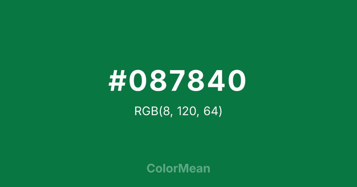 #087840 RGB value is (8, 120, 64). The hex color red value is 8, green is 120, and blue is 64. Its HSL format shows a hue of 150°, saturation of 88 percent, and lightness of 25 percent. The CMYK process values are 93 percent, 0 percent, 47 percent, 53 percent.