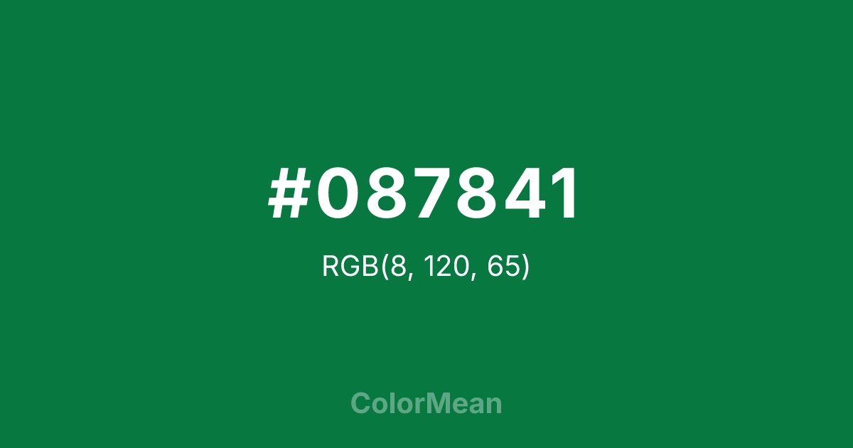 #087841 RGB value is (8, 120, 65). The hex color red value is 8, green is 120, and blue is 65. Its HSL format shows a hue of 151°, saturation of 88 percent, and lightness of 25 percent. The CMYK process values are 93 percent, 0 percent, 46 percent, 53 percent.