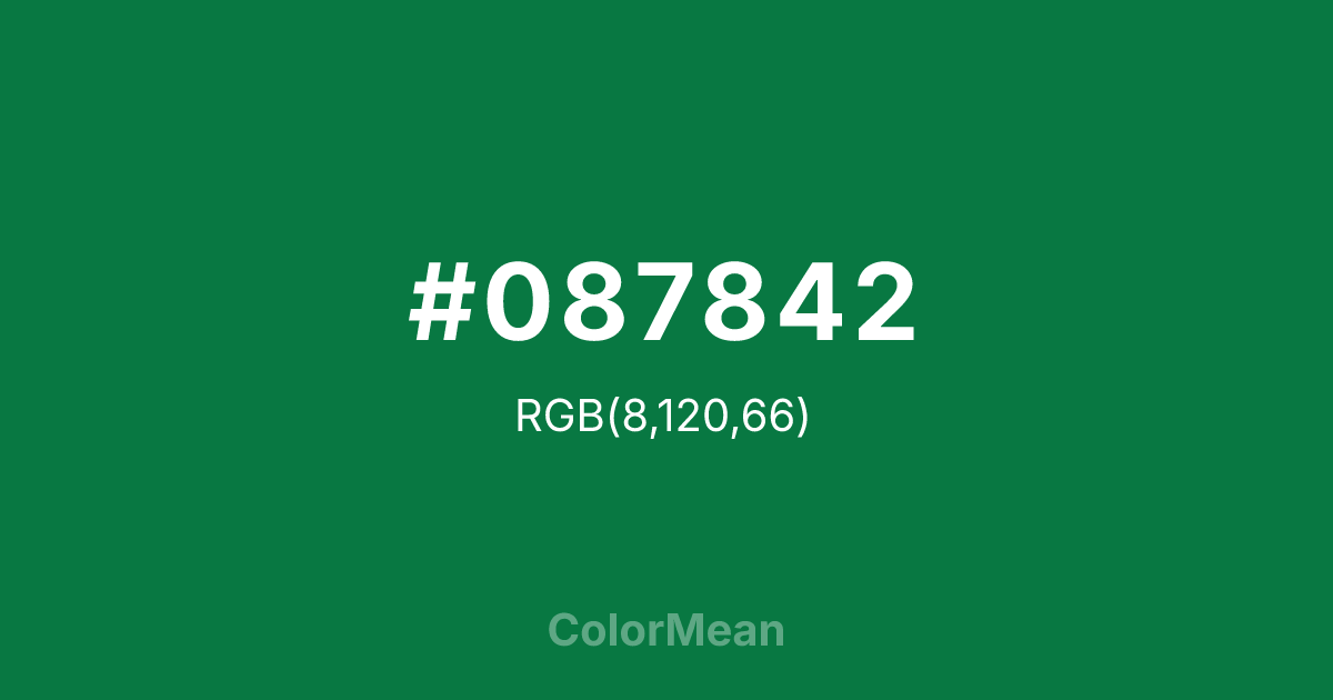 #087842 RGB value is (8, 120, 66). The hex color red value is 8, green is 120, and blue is 66. Its HSL format shows a hue of 151°, saturation of 88 percent, and lightness of 25 percent. The CMYK process values are 93 percent, 0 percent, 45 percent, 53 percent.