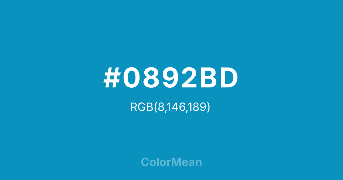 #0892BD RGB value is (8, 146, 189). The hex color red value is 8, green is 146, and blue is 189. Its HSL format shows a hue of 194°, saturation of 92 percent, and lightness of 39 percent. The CMYK process values are 96 percent, 23 percent, 0 percent, 26 percent.