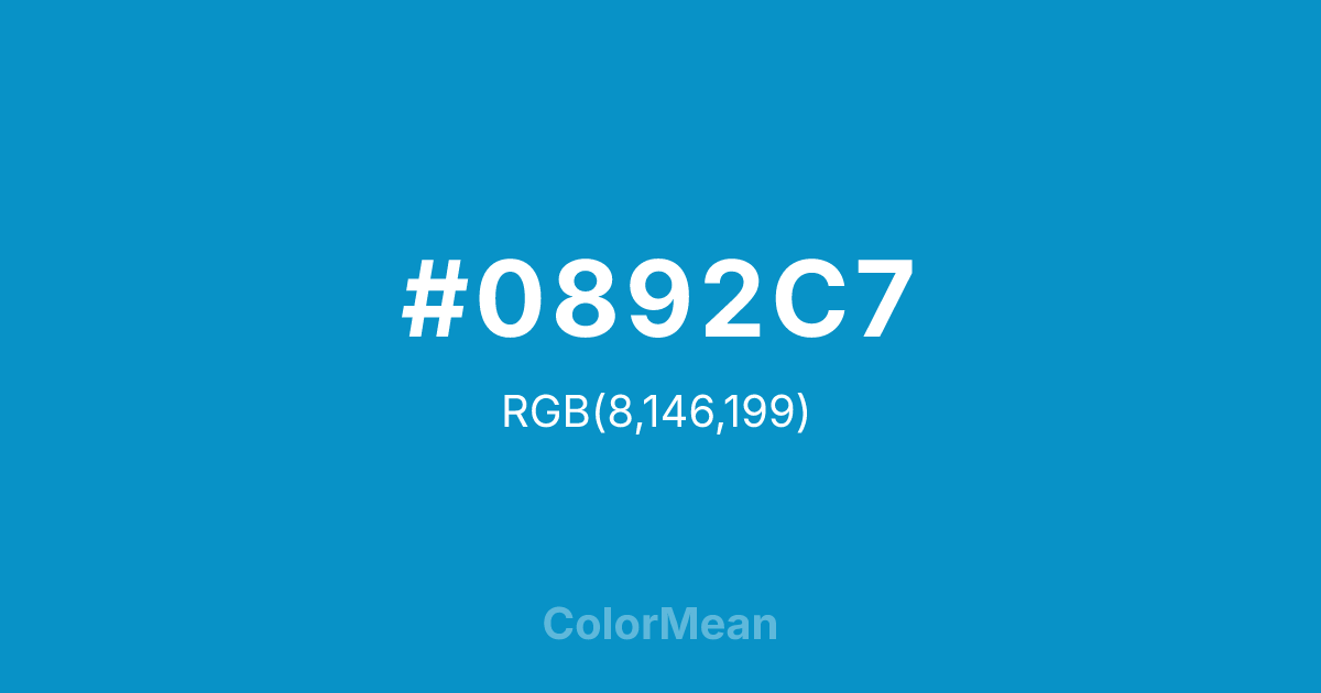 #0892C7 RGB value is (8, 146, 199). The hex color red value is 8, green is 146, and blue is 199. Its HSL format shows a hue of 197°, saturation of 92 percent, and lightness of 41 percent. The CMYK process values are 96 percent, 27 percent, 0 percent, 22 percent.