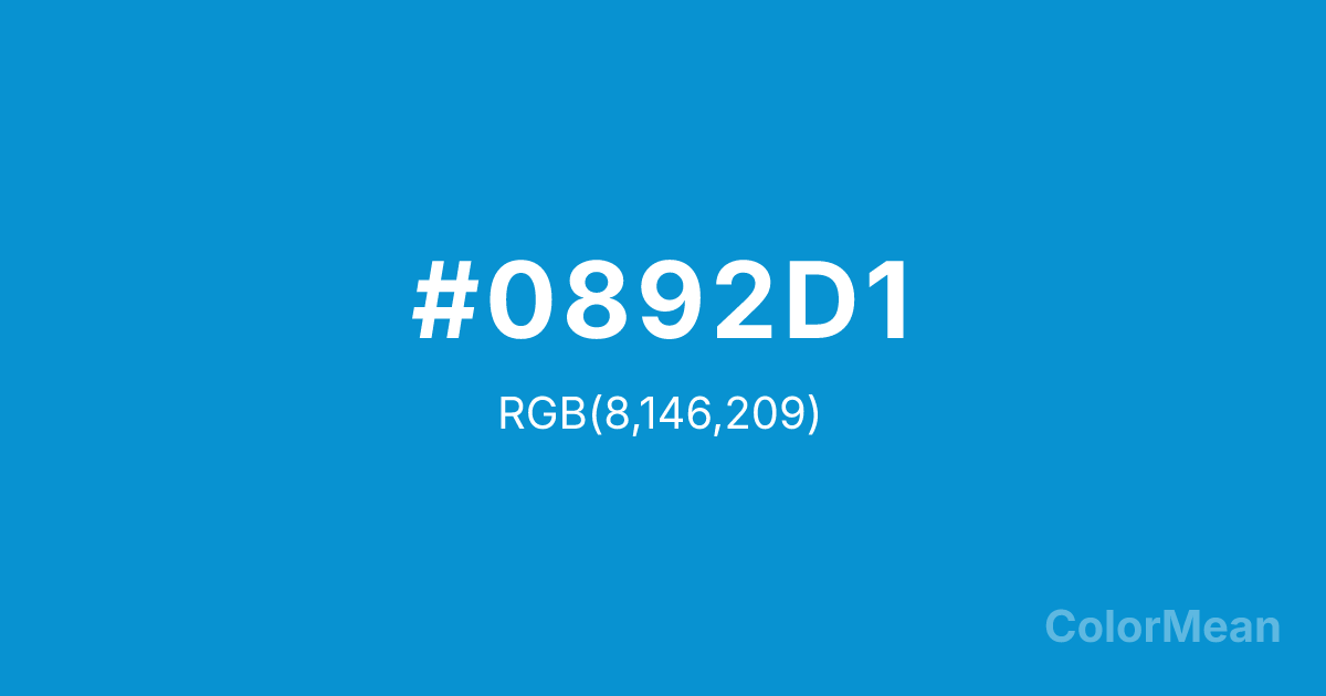 #0892D1 RGB value is (8, 146, 209). The hex color red value is 8, green is 146, and blue is 209. Its HSL format shows a hue of 199°, saturation of 93 percent, and lightness of 43 percent. The CMYK process values are 96 percent, 30 percent, 0 percent, 18 percent.
