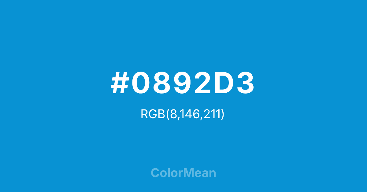 #0892D3 RGB value is (8, 146, 211). The hex color red value is 8, green is 146, and blue is 211. Its HSL format shows a hue of 199°, saturation of 93 percent, and lightness of 43 percent. The CMYK process values are 96 percent, 31 percent, 0 percent, 17 percent.