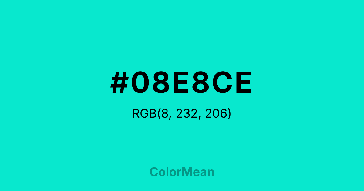 #08E8CE RGB value is (8, 232, 206). The hex color red value is 8, green is 232, and blue is 206. Its HSL format shows a hue of 173°, saturation of 93 percent, and lightness of 47 percent. The CMYK process values are 97 percent, 0 percent, 11 percent, 9 percent.