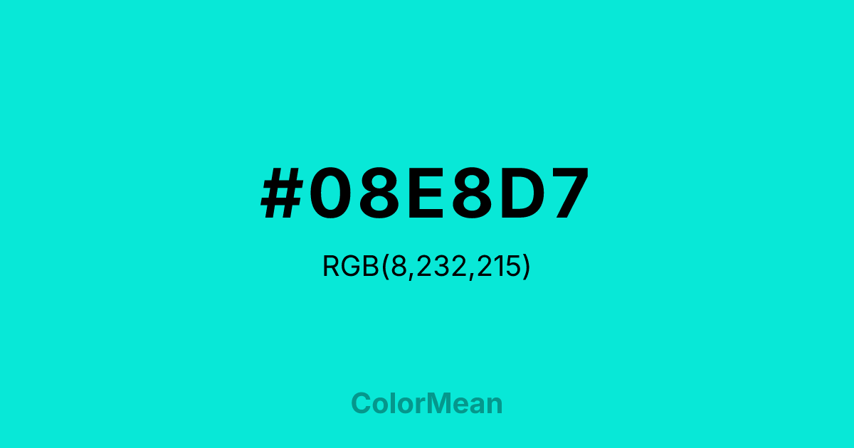 #08E8D7 RGB value is (8, 232, 215). The hex color red value is 8, green is 232, and blue is 215. Its HSL format shows a hue of 175°, saturation of 93 percent, and lightness of 47 percent. The CMYK process values are 97 percent, 0 percent, 7 percent, 9 percent.