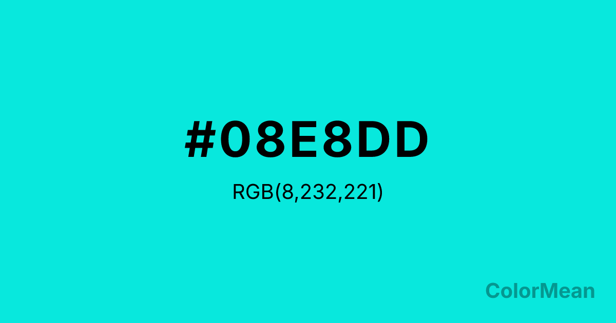 #08E8DD RGB value is (8, 232, 221). The hex color red value is 8, green is 232, and blue is 221. Its HSL format shows a hue of 177°, saturation of 93 percent, and lightness of 47 percent. The CMYK process values are 97 percent, 0 percent, 5 percent, 9 percent.