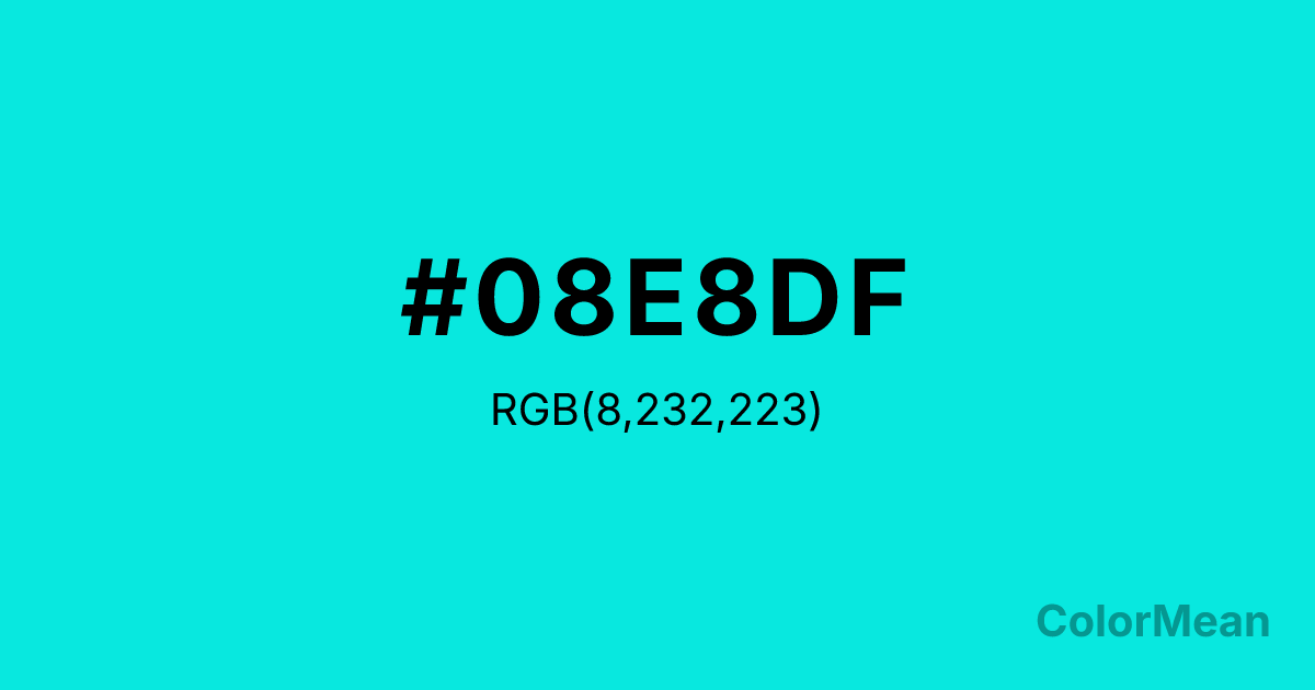 #08E8DF RGB value is (8, 232, 223). The hex color red value is 8, green is 232, and blue is 223. Its HSL format shows a hue of 178°, saturation of 93 percent, and lightness of 47 percent. The CMYK process values are 97 percent, 0 percent, 4 percent, 9 percent.