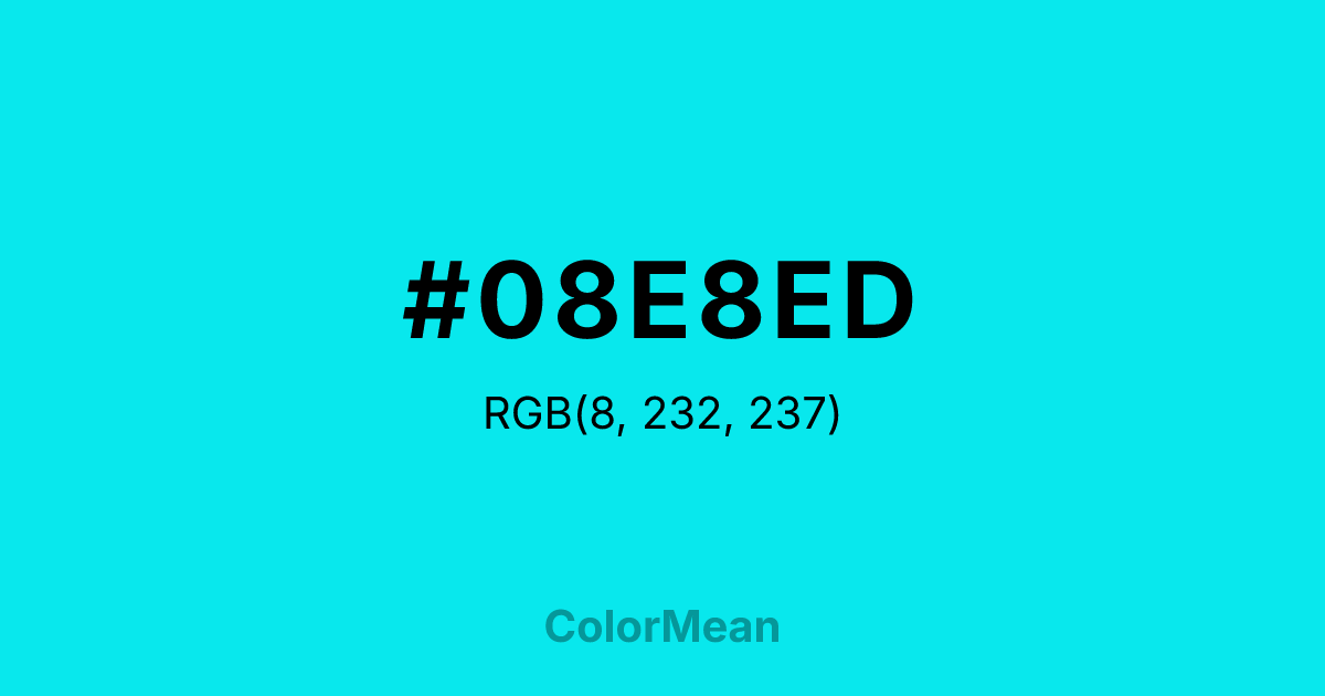 #08E8ED RGB value is (8, 232, 237). The hex color red value is 8, green is 232, and blue is 237. Its HSL format shows a hue of 181°, saturation of 93 percent, and lightness of 48 percent. The CMYK process values are 97 percent, 2 percent, 0 percent, 7 percent.