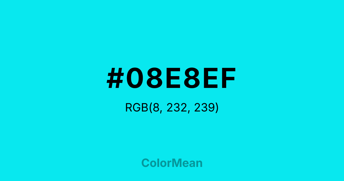 #08E8EF RGB value is (8, 232, 239). The hex color red value is 8, green is 232, and blue is 239. Its HSL format shows a hue of 182°, saturation of 94 percent, and lightness of 48 percent. The CMYK process values are 97 percent, 3 percent, 0 percent, 6 percent.