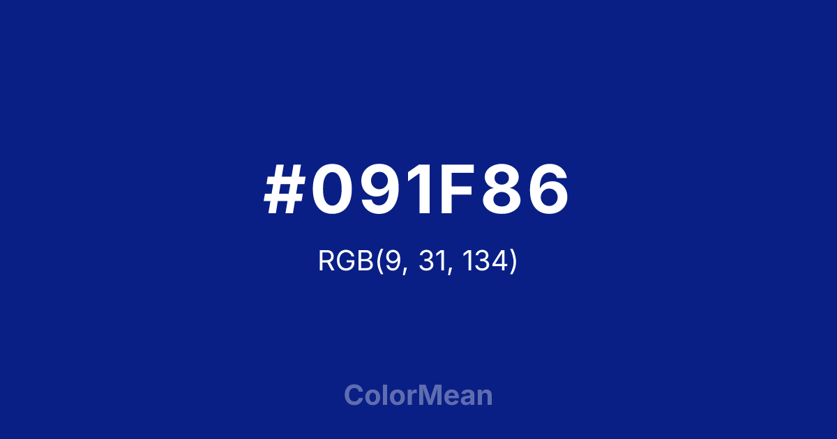 #091F86 RGB value is (9, 31, 134). The hex color red value is 9, green is 31, and blue is 134. Its HSL format shows a hue of 229°, saturation of 87 percent, and lightness of 28 percent. The CMYK process values are 93 percent, 77 percent, 0 percent, 47 percent.