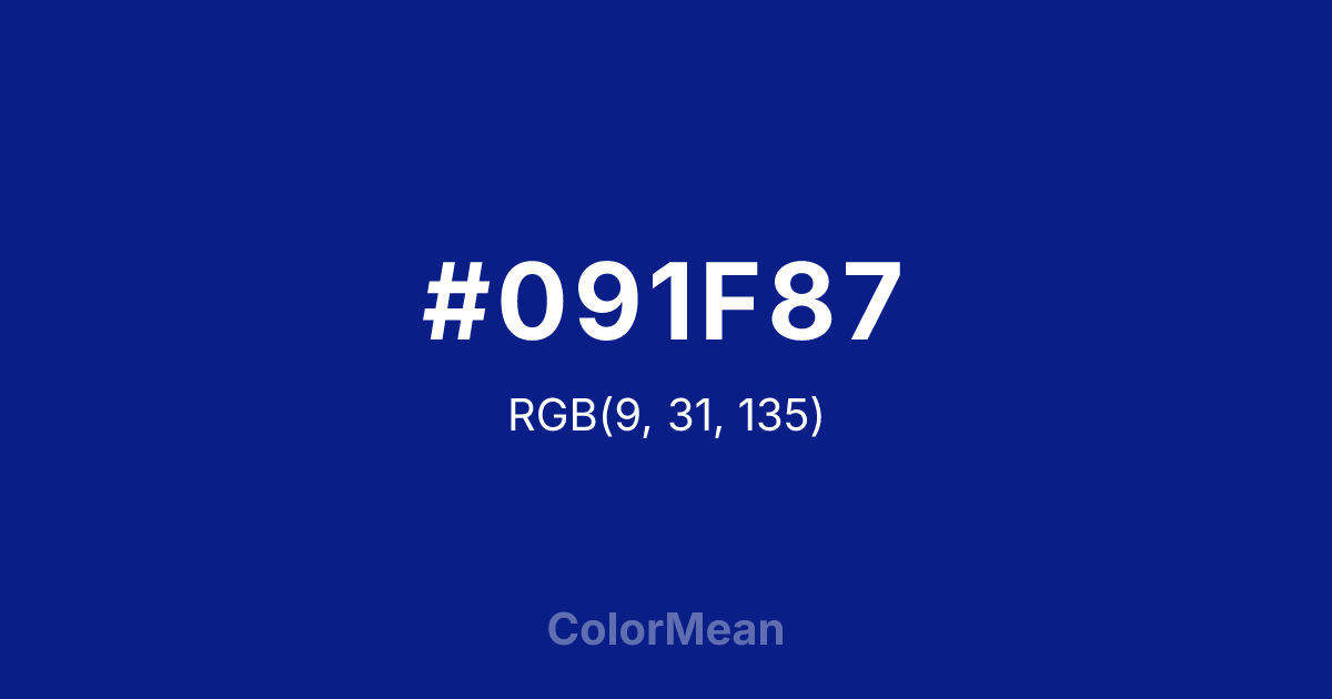 #091F87 RGB value is (9, 31, 135). The hex color red value is 9, green is 31, and blue is 135. Its HSL format shows a hue of 230°, saturation of 88 percent, and lightness of 28 percent. The CMYK process values are 93 percent, 77 percent, 0 percent, 47 percent.