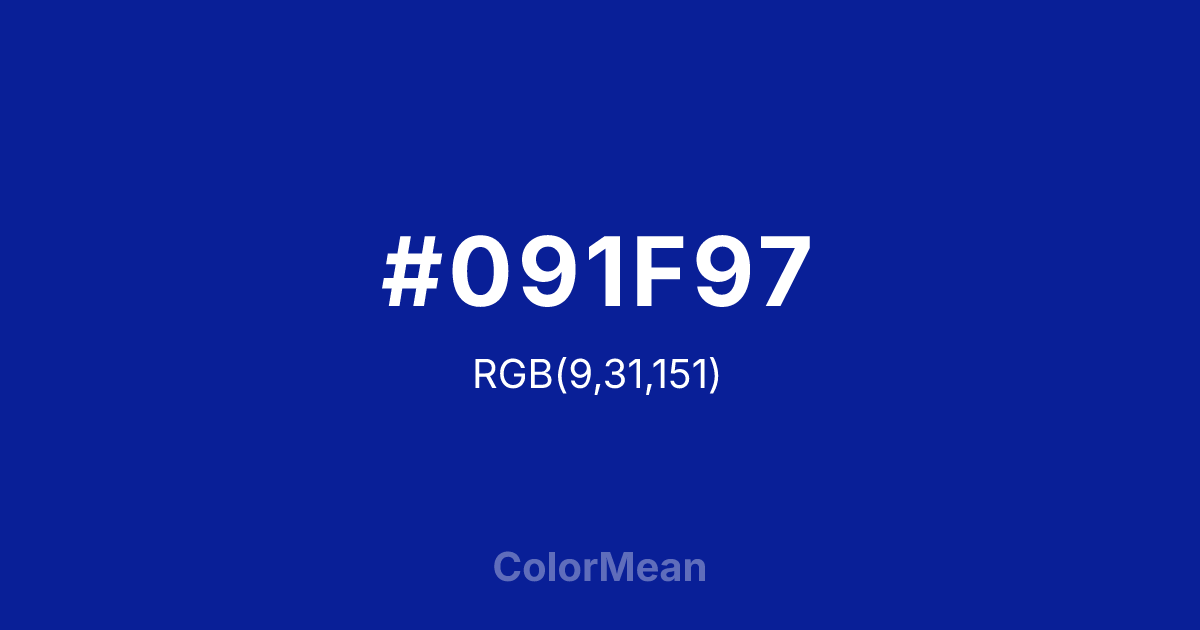 #091F97 RGB value is (9, 31, 151). The hex color red value is 9, green is 31, and blue is 151. Its HSL format shows a hue of 231°, saturation of 89 percent, and lightness of 31 percent. The CMYK process values are 94 percent, 79 percent, 0 percent, 41 percent.