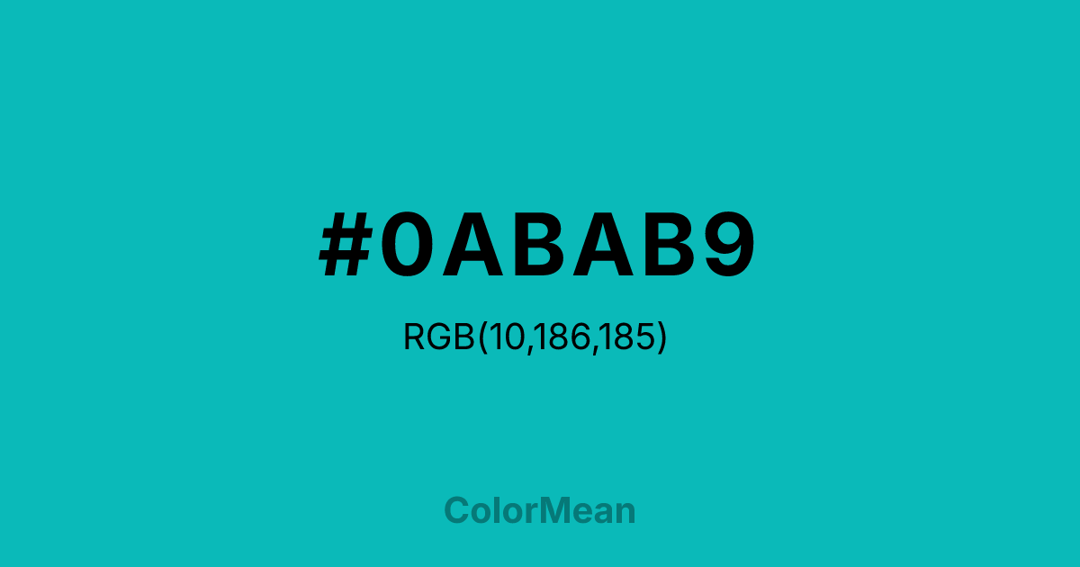 #0ABAB9 RGB value is (10, 186, 185). The hex color red value is 10, green is 186, and blue is 185. Its HSL format shows a hue of 180°, saturation of 90 percent, and lightness of 38 percent. The CMYK process values are 95 percent, 0 percent, 1 percent, 27 percent.