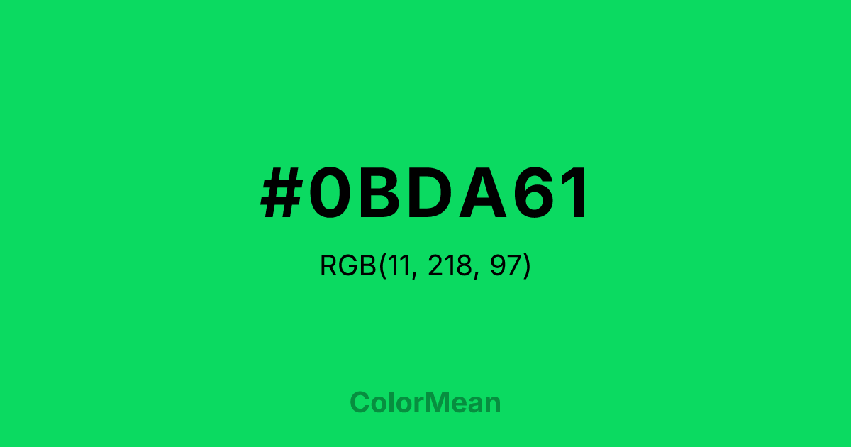 #0BDA61 RGB value is (11, 218, 97). The hex color red value is 11, green is 218, and blue is 97. Its HSL format shows a hue of 145°, saturation of 90 percent, and lightness of 45 percent. The CMYK process values are 95 percent, 0 percent, 56 percent, 15 percent.