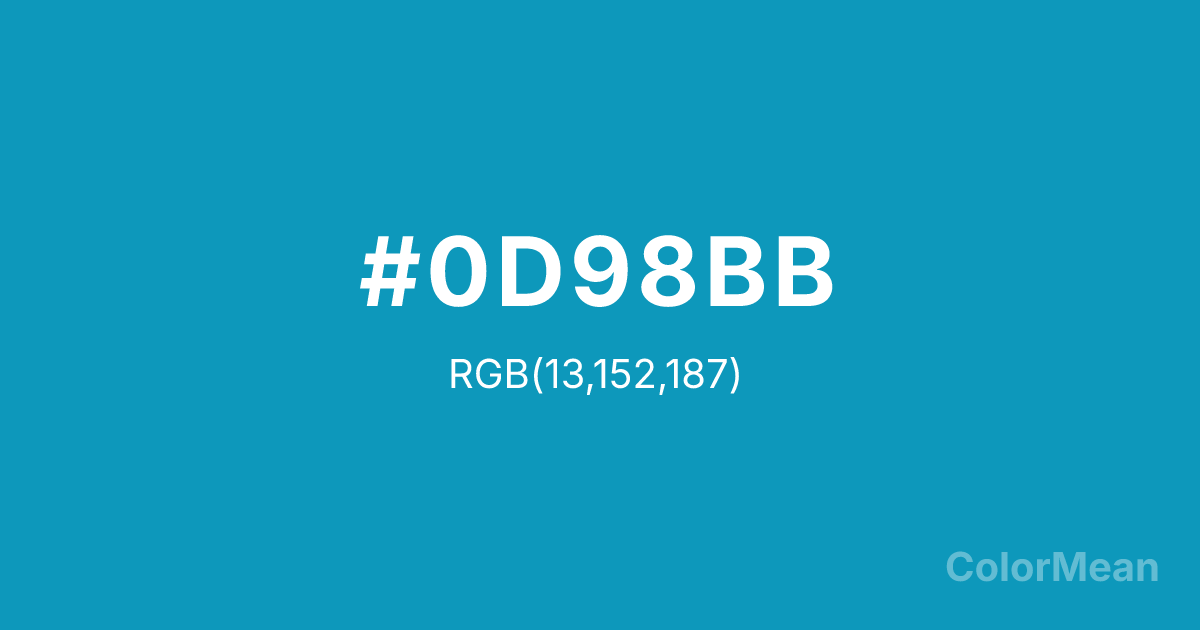 #0D98BB RGB value is (13, 152, 187). The hex color red value is 13, green is 152, and blue is 187. Its HSL format shows a hue of 192°, saturation of 87 percent, and lightness of 39 percent. The CMYK process values are 93 percent, 19 percent, 0 percent, 27 percent.