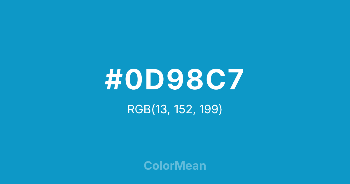 #0D98C7 RGB value is (13, 152, 199). The hex color red value is 13, green is 152, and blue is 199. Its HSL format shows a hue of 195°, saturation of 88 percent, and lightness of 42 percent. The CMYK process values are 93 percent, 24 percent, 0 percent, 22 percent.
