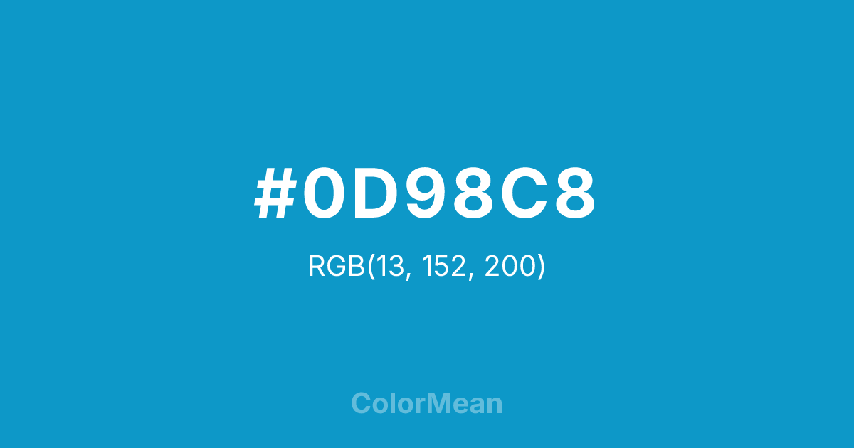 #0D98C8 RGB value is (13, 152, 200). The hex color red value is 13, green is 152, and blue is 200. Its HSL format shows a hue of 195°, saturation of 88 percent, and lightness of 42 percent. The CMYK process values are 94 percent, 24 percent, 0 percent, 22 percent.