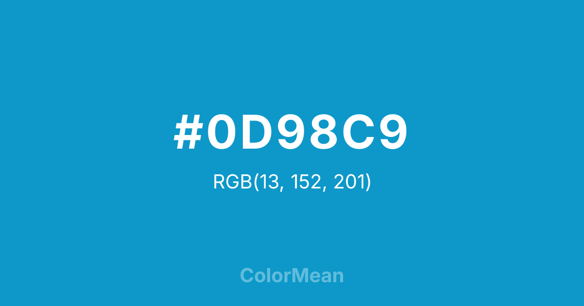 #0D98C9 RGB value is (13, 152, 201). The hex color red value is 13, green is 152, and blue is 201. Its HSL format shows a hue of 196°, saturation of 88 percent, and lightness of 42 percent. The CMYK process values are 94 percent, 24 percent, 0 percent, 21 percent.