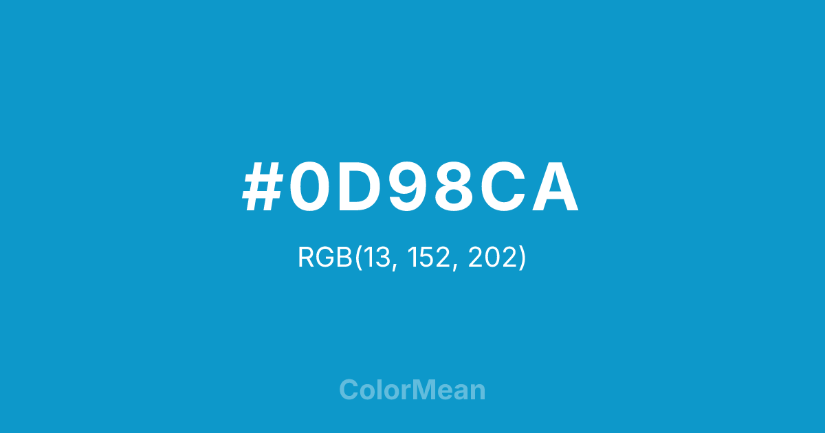 #0D98CA RGB value is (13, 152, 202). The hex color red value is 13, green is 152, and blue is 202. Its HSL format shows a hue of 196°, saturation of 88 percent, and lightness of 42 percent. The CMYK process values are 94 percent, 25 percent, 0 percent, 21 percent.