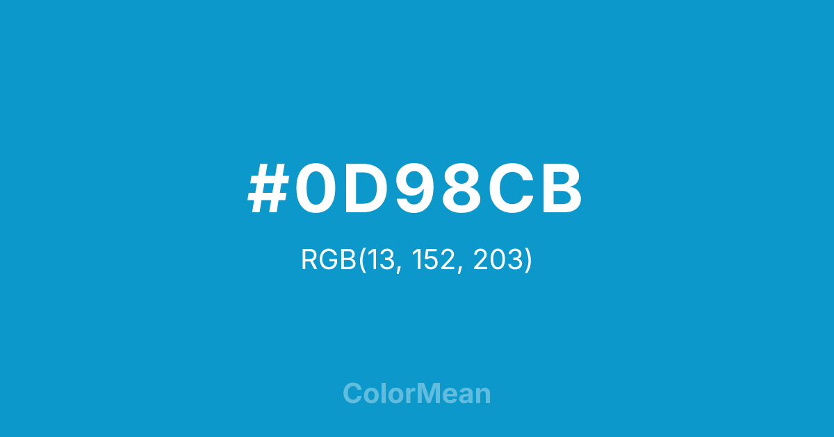 #0D98CB RGB value is (13, 152, 203). The hex color red value is 13, green is 152, and blue is 203. Its HSL format shows a hue of 196°, saturation of 88 percent, and lightness of 42 percent. The CMYK process values are 94 percent, 25 percent, 0 percent, 20 percent.