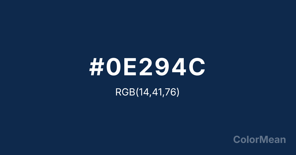 #0E294C RGB value is (14, 41, 76). The hex color red value is 14, green is 41, and blue is 76. Its HSL format shows a hue of 214°, saturation of 69 percent, and lightness of 18 percent. The CMYK process values are 82 percent, 46 percent, 0 percent, 70 percent.