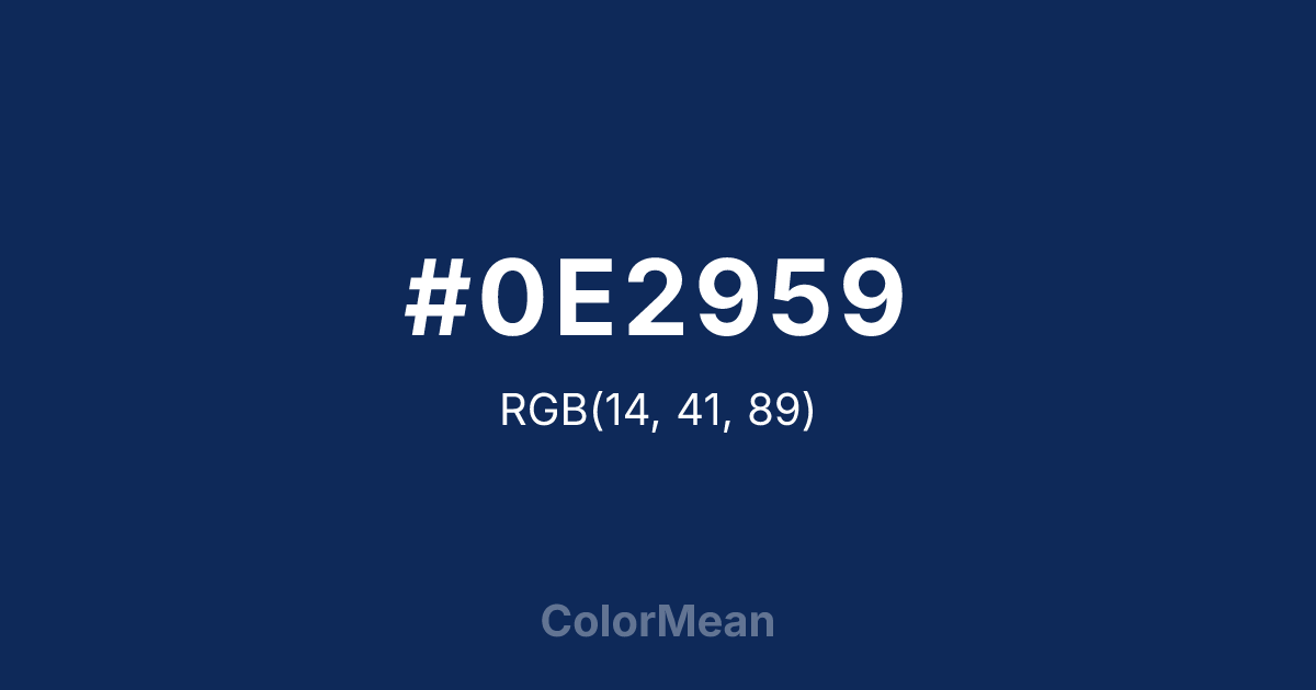 #0E2959 RGB value is (14, 41, 89). The hex color red value is 14, green is 41, and blue is 89. Its HSL format shows a hue of 218°, saturation of 73 percent, and lightness of 20 percent. The CMYK process values are 84 percent, 54 percent, 0 percent, 65 percent.