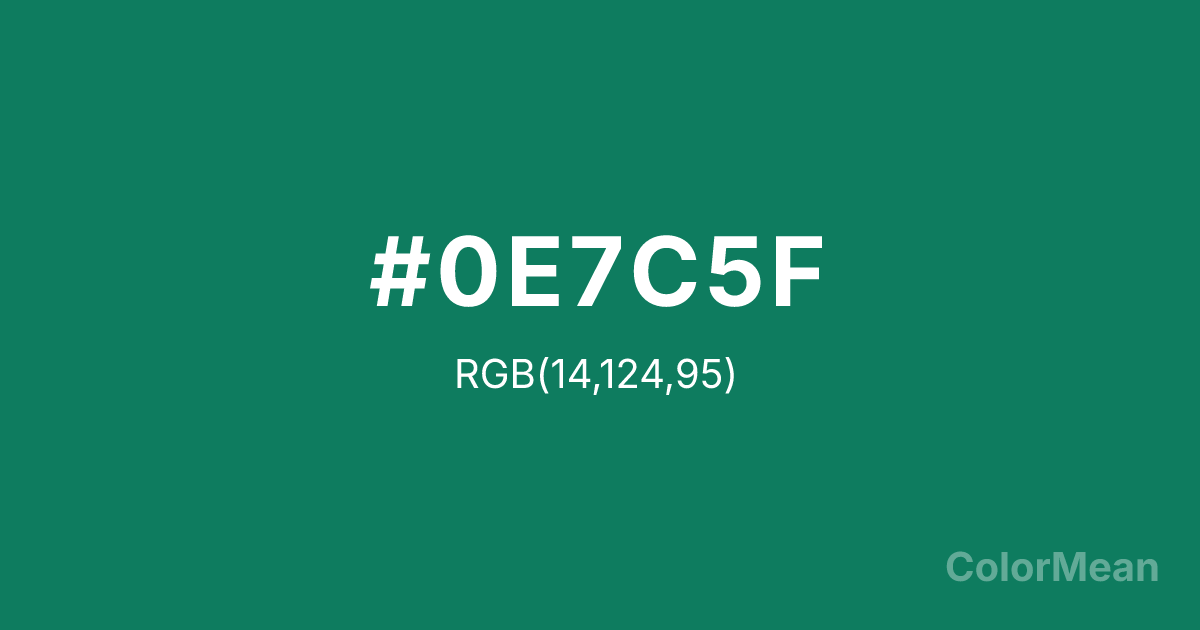 #0E7C5F RGB value is (14, 124, 95). The hex color red value is 14, green is 124, and blue is 95. Its HSL format shows a hue of 164°, saturation of 80 percent, and lightness of 27 percent. The CMYK process values are 89 percent, 0 percent, 23 percent, 51 percent.