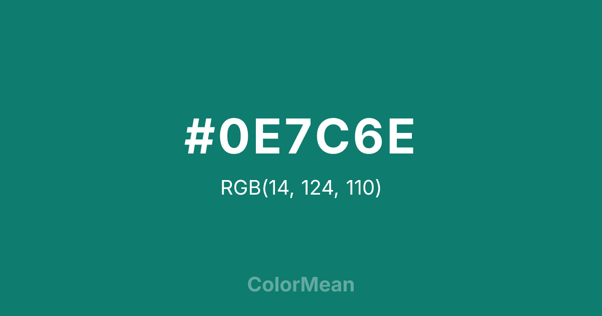 #0E7C6E RGB value is (14, 124, 110). The hex color red value is 14, green is 124, and blue is 110. Its HSL format shows a hue of 172°, saturation of 80 percent, and lightness of 27 percent. The CMYK process values are 89 percent, 0 percent, 11 percent, 51 percent.
