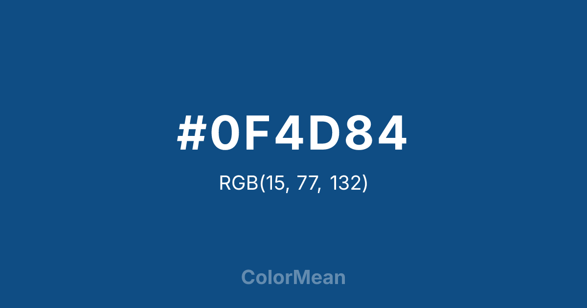 #0F4D84 RGB value is (15, 77, 132). The hex color red value is 15, green is 77, and blue is 132. Its HSL format shows a hue of 208°, saturation of 80 percent, and lightness of 29 percent. The CMYK process values are 89 percent, 42 percent, 0 percent, 48 percent.