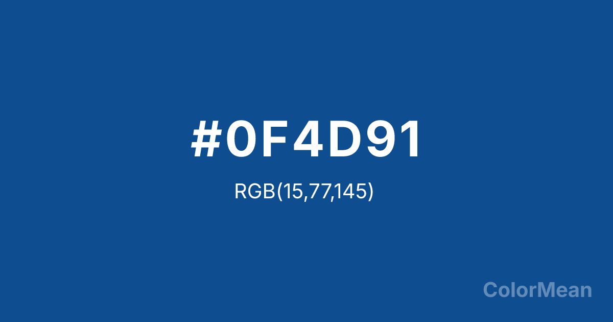 #0F4D91 RGB value is (15, 77, 145). The hex color red value is 15, green is 77, and blue is 145. Its HSL format shows a hue of 211°, saturation of 81 percent, and lightness of 31 percent. The CMYK process values are 90 percent, 47 percent, 0 percent, 43 percent.