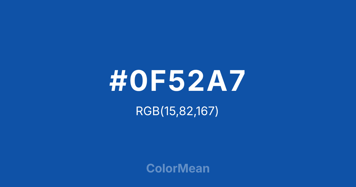 #0F52A7 RGB value is (15, 82, 167). The hex color red value is 15, green is 82, and blue is 167. Its HSL format shows a hue of 214°, saturation of 84 percent, and lightness of 36 percent. The CMYK process values are 91 percent, 51 percent, 0 percent, 35 percent.